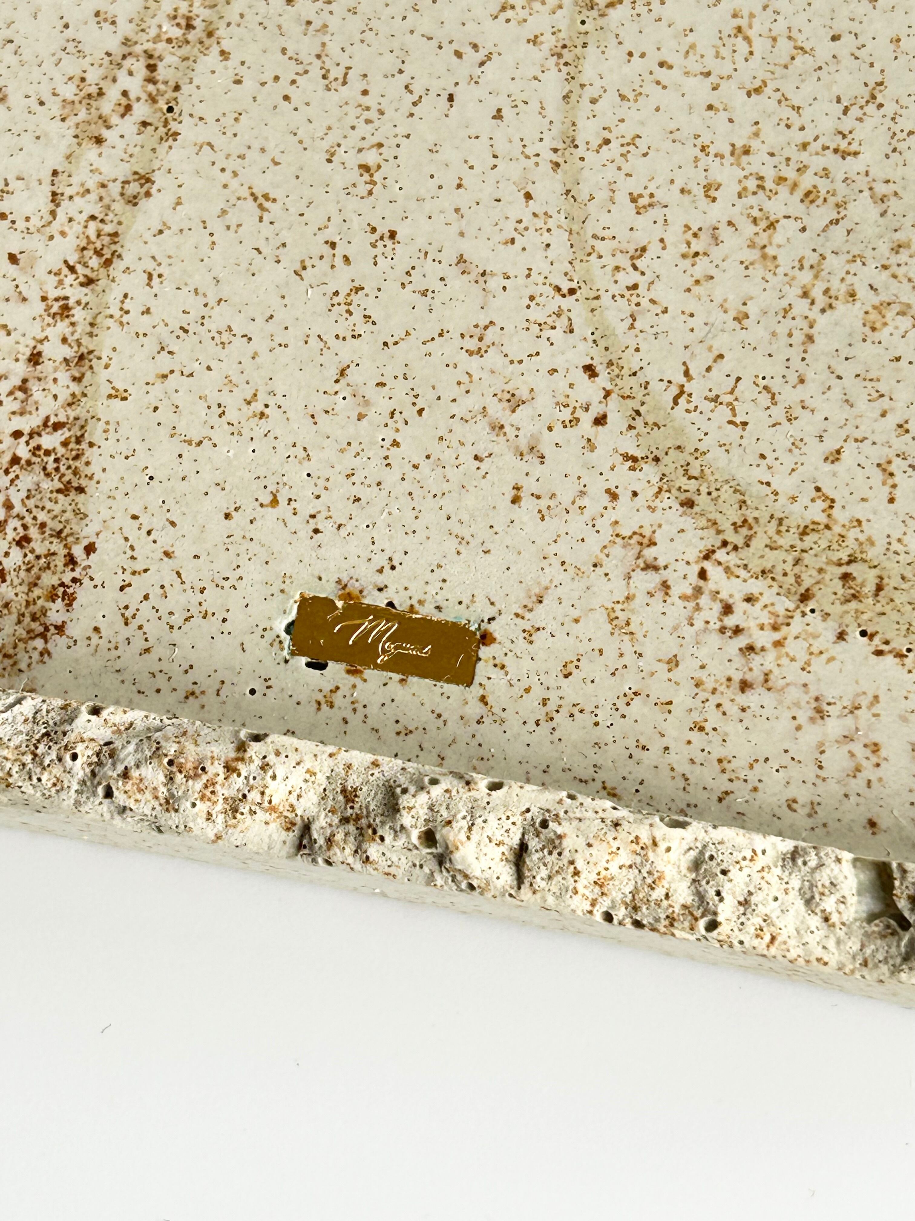 石のような質感と高い強度を持ち、環境にもやさしい素材としてインテリアやアート作品に使われています。